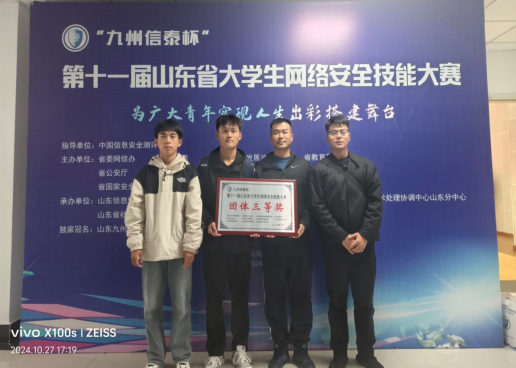 10月27日,由山东省委网信办、共青团山东省委、山东省公安厅等单位联合举办的第十一届山东省大学生网络安全技能大赛决赛在曲阜师范大学举行,全省80余所本科、高职院校同台竞技。经过六个多小时的激烈角逐,我校由谢堂杰、杨帆和张鑫三名学生组成的代表队,荣获团体三等奖!