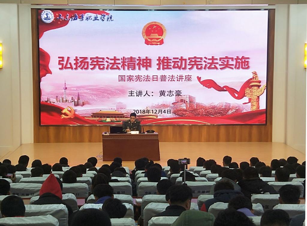 12月4日下午,在第五个国家宪法日来临之际,学院在图书馆报告厅召开宪法主题讲座,邀请央子边防派出所黄志豪警官到校讲课,此次讲座主题为“弘扬宪法精神,推动宪法实施”。团委李雪书记和安保处孟凡明处长共同主持了讲座,部分教师和18级部分学生聆听了本次讲座。