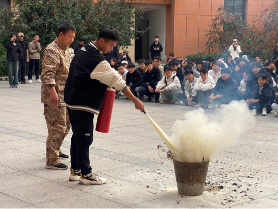 随后,学校安全管理处孟凡明老师向学生们展示了消防器材的正确使用方法,通过讲解和示范,师生们学习了火灾初期扑救、火场逃生技巧以及自救互救等相关知识,多名同学现场进行了灭火器的使用体验。