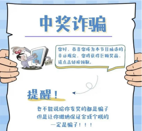 骗子称受害人中了大奖,要求支付相关手续费、税款或预存款等。