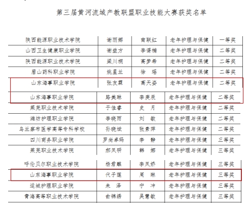 近日,第三届黄河流域产教联盟——老年护理与保健赛项在山西运城举行,学校健康管理学院2023级智慧健康养老服务与管理专业路美琳(指导教师:李庚辰)、张友霖(指导教师:高天姿)、代子莲(指导教师:周琳)三名学生赢得比赛二等奖两项、三等奖一项。