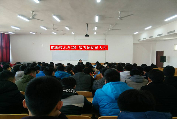 2月29日下午,航海技术系召开了2014级学生的考证动员大会。动员会由臧书记主持,许主任讲话,系部李晓伟、任士琳、王建、杨静等老师和2014级辅导员及全体同学参加。