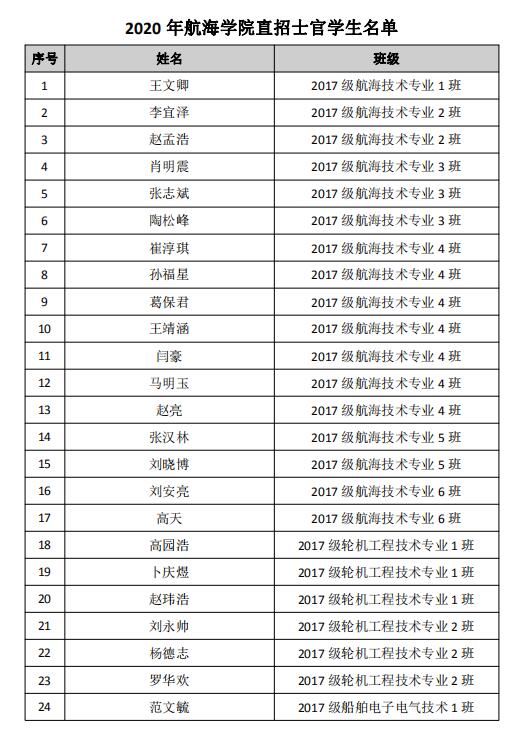 为做好2020年大学生应征入伍工作,鼓励学生积极参与应征入伍,提高兵源质量,推进国防和军队现代化建设,航海学院多次邀请武装部老师讲述征兵的意义及相关优惠政策,并积极配合充分调动同学们报名应征的积极性。经过层层筛选,今年最终有24名同学从中脱颖而出,通过直招士官的严格筛选,光荣入伍。