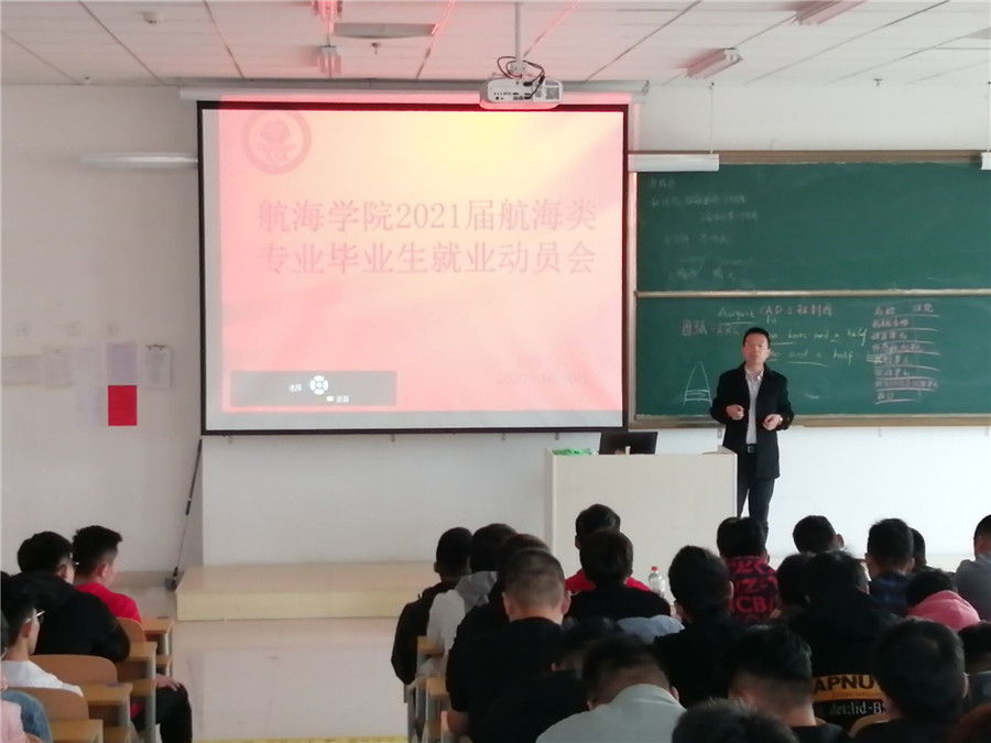 为进一步落实保民生促就业的国家政策,加强学生对当前疫情常态化趋势下就业前景的认识,帮助学生明确职业规划、树立正确的择业观和就业观念,航海学院于10月6日下午在3313教室组织召开“2021届航海类专业毕业生就业动员会”。九五至尊VI 副校长/航海学院院长吕明、航海学院院长助理刘继峰、毕业班辅导员及2021届全体毕业生参加了本次动员会。