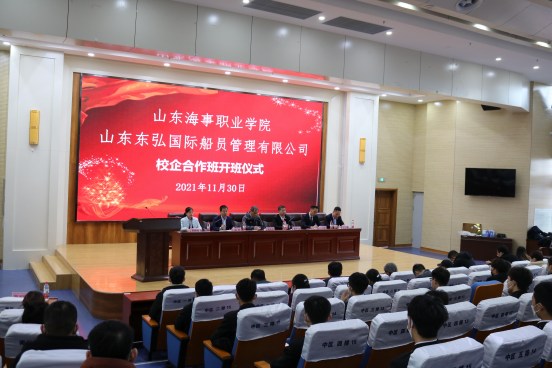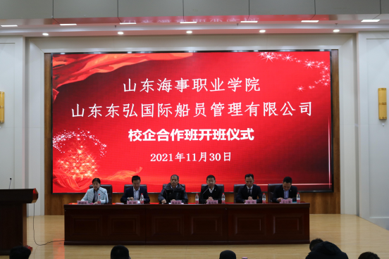为深化产教融合校企合作,推动现代职业教育高质量发展,11月30日下午,航海学院与山东东弘国际船员管理有限公司在图书馆报告厅举行校企合作东弘订单班开班仪式。东弘国际海事集团董事长姜明旸、培训总监张伟等企业领导,学校副校长张庆会、副校长/航海学院院长吕明、航海学院教师及“东弘校企订单班”全体学生参加了开班仪式。