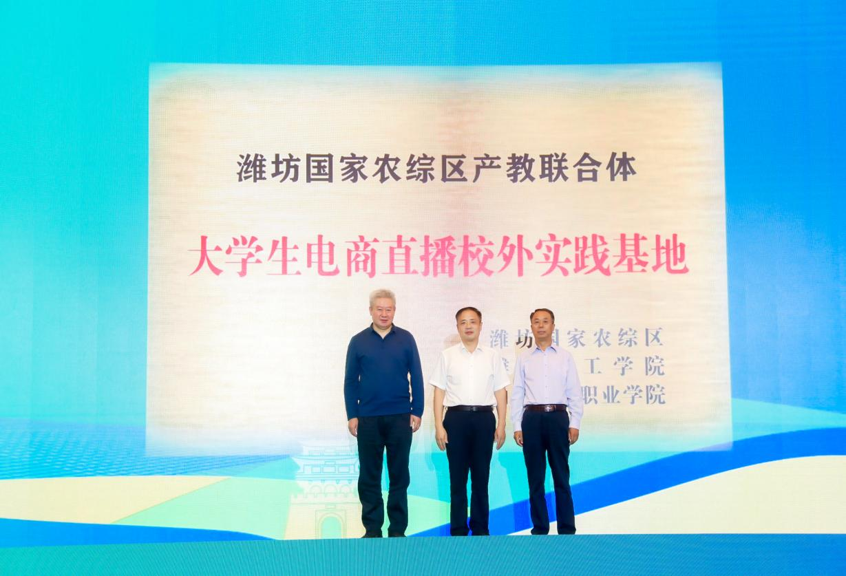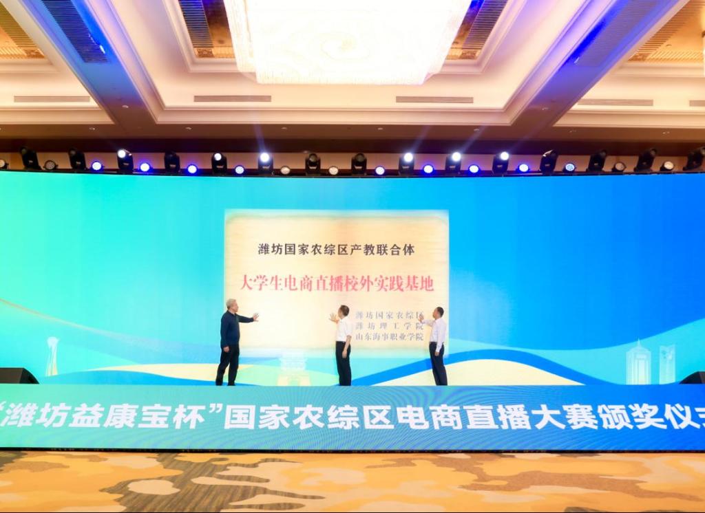 比赛结束,大赛主办方组织在潍坊富华大酒店举行了颁奖仪式,为电商直播大赛获奖团队颁发奖杯和荣誉证书,为综合和单项奖授牌,企业与主播签订直播带货意向协议。最后,市政府副秘书长、潍坊国家农综区推进办专职副主任张守兵、潍坊理工学院副校长、经济管理学院院长刘庆林与九五至尊VI副校长宋志刚共同上台为“潍坊国家农综区产教联合体——大学生电商直播校外实践基地”揭牌,后续,我校将进一步深化产教融合、校企合作,“政、校、企、村、研”五位联动,持续为乡村振兴注入新鲜活力。为服务乡村振兴,助力区域经济发展贡献山海力量。