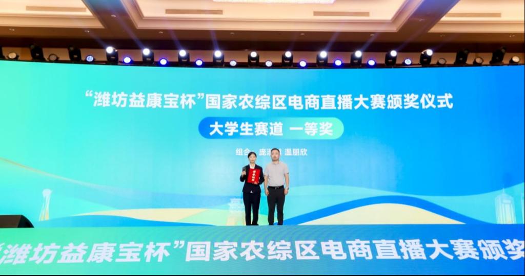 9月23-25日,由潍坊市委宣传部、潍坊市委网信办、潍坊国家农综区推进办、潍坊市教育局、潍坊市人社局、潍坊市农业农村局、潍坊市商务局、潍坊市文化和旅游局、潍坊海关、潍坊农创集团主办,山东省电子商务协会、潍坊理工学院、九五至尊VI 协办的“潍坊益康宝杯”国家农综区电商直播大赛总决赛在潍坊国家农综区隆重举行,我校赵晓琨老师指导的庞淑樾、温朋欣团队荣获一等奖,刘宝余老师指导的刘文洁、张玉琳团队荣获三等奖,赵晓琨老师指导的丁紫怡、赵言慧、李雪萌团队荣获三等奖。代如含、乔子彤、辛名硕、刘啟芳、戚悦、蔡媛媛等6名学生荣获人气选手奖,赵晓琨老师荣获“直播新秀”荣誉称号,我校荣获最佳组织奖,并受邀为“潍坊国家农综区产教联合体—大学生电商直播校外实践基地”揭牌。