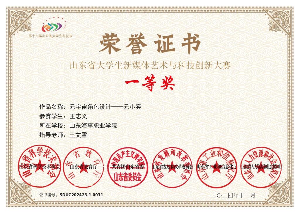 近日,由山东省科学技术协会、山东省教育厅、共青团山东省委、山东省发展和改革委员会、山东省工业和信息化厅、山东省人力资源和社会保障厅联合主办的第十六届山东省大学生科技节——山东省大学生新媒体艺术与科技创新大赛圆满落幕。我校电商学院参赛作品《元宇宙设计—元小奕》凭借对新媒体时代艺术表达的深刻理解,以及对科技创新应用的巧妙构思,斩获一等奖。