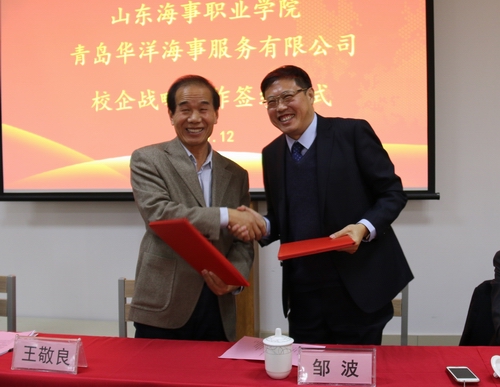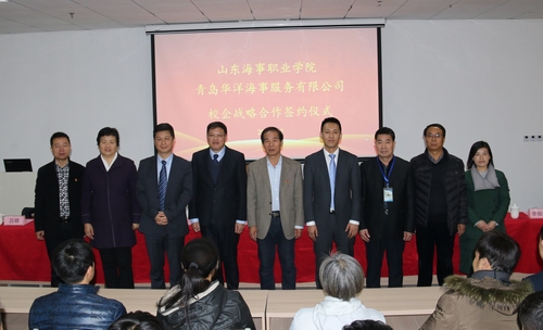 12月27日上午,山东海事海事职业学院与青岛华洋海事服务有限公司校企战略合作签约仪式在图书馆第二信息化教室举行。青岛华洋海事服务有限公司总经理邹波、常务副总经理刘长江、副总经理王旭、学院院长王敬良、副院长李振鹏、校企合作处处长宋志刚及航海学院领导等出席签约仪式。签约仪式由副院长李振鹏主持。
