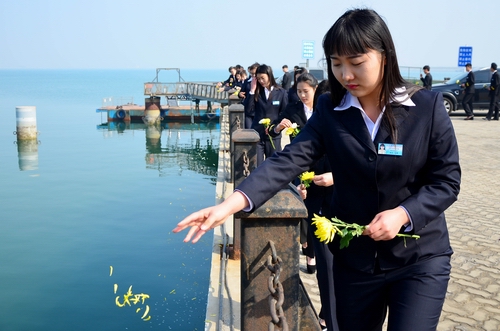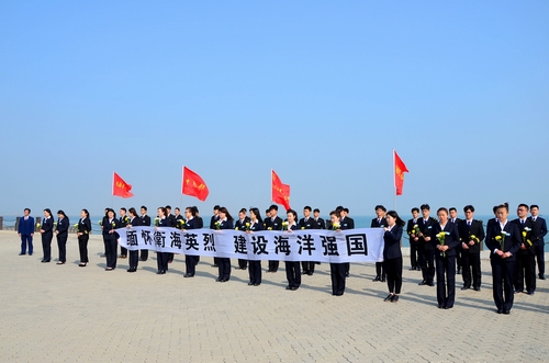 哀乐声响起,同学们手拿“缅怀卫海英烈,建设海洋强国”的横幅,师生整齐列队,庄严肃立,面对大海向卫海英烈默哀。“祖国至上,人民为先。革命先烈,浩气长存。继承遗志,自强不息……”全体师生排着整齐的队伍,面向辽阔的大海,庄严宣誓。学生们表示,不忘历史使命,为民族的崛起而奋发进取,为祖国的昌盛而努力学习,为弘扬先烈遗志而励精图治,为民族的尊严而自强不息。随后,在长长的哀乐声中,学生们向卫海英烈敬献鲜花,将一瓣瓣黄、白色菊花洒入波涛汹涌的大海。