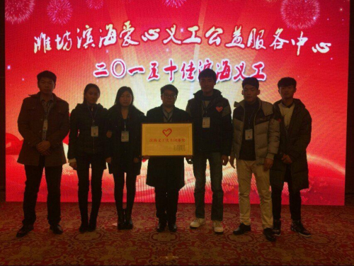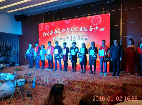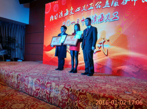 2016年1月2日,由滨海义工服务中心主办的以“爱心公益,你我同行”为主题的首届爱心义工颁奖晚会在潍坊滨海海正大酒店隆重举行。鸢都义工理事长孙志达,九五至尊VI 张建军老师,滨海义工崔同磊、张国梁等100多名义工出席了颁奖晚会。