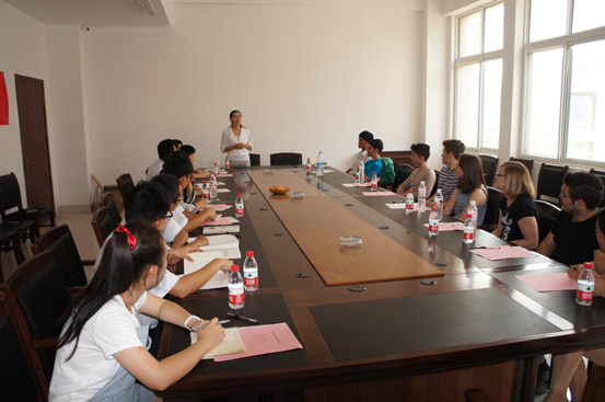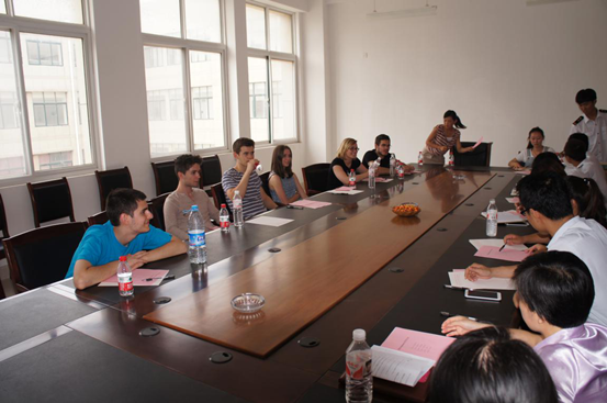 在会议室,随访的6名英国学生也与学院的学生代表从专业学习、生活习惯、兴趣爱好、文化习俗等多个方面进行了互动交流。双方同学通过交流,迅速找到了共同话题,交流现场不时传出愉快的笑声,短暂的相处,令双方同学成为了好朋友。访问交流结束后,双方师生在教学楼前合影留念。