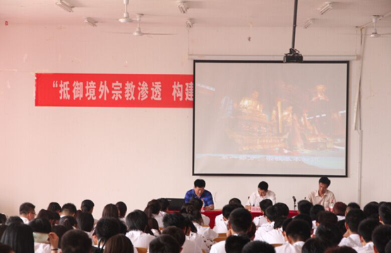 王国臣大队长就新时期高校大学生的意识形态,从如何正确看待民族宗教问题、境外敌对势力利用宗教进行渗透的实质、当前高校抵御境外宗教渗透面临的形势及境外宗教在高校的渗透途径等方面,通过列举大量实例使全体师生从思想深处对境外宗教渗透和邪教问题有了一个质的认识,提高了防范意识。最后王国臣大队长对全院师生提出了希望,希望高校师生统一思想,提高认识,崇尚科学,远离宗教和邪教,做现代文明的追求者,实践者和传播者。