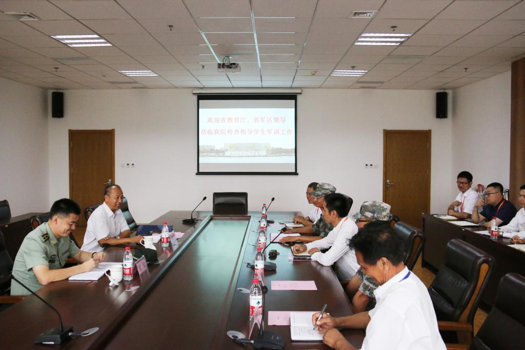 副院长仉继航向省督察组介绍了学院相关情况,就学院2018年学生军训工作从军训概况、军训特点、军训收获以及军事理论课教学和征兵工作四方面做了详细汇报。承训部队首长贾红博对施训情况做了汇报并对高校军训工作提出了建设性建议。