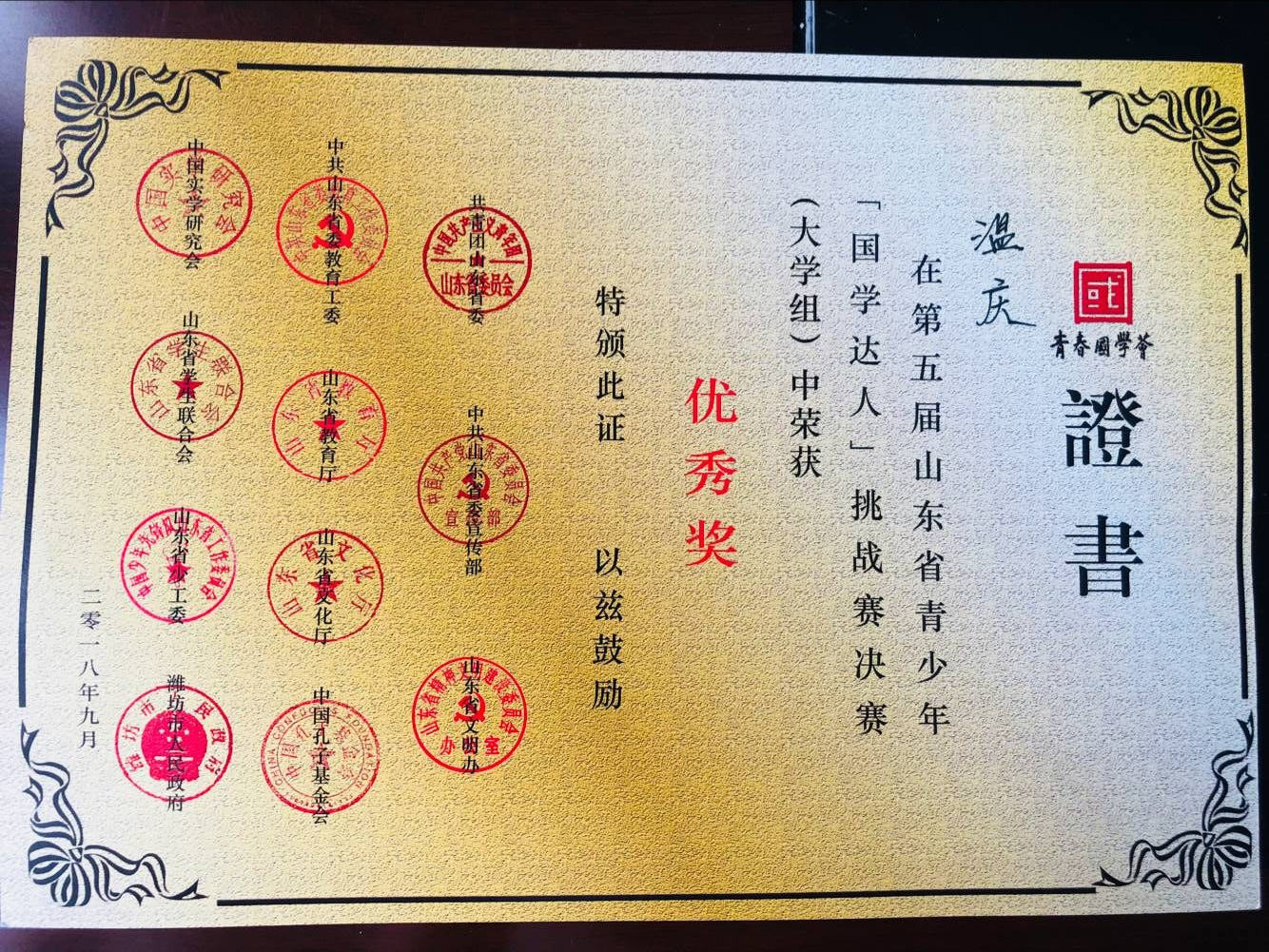 9月21日,2018年齐鲁学子青春国学荟优秀国学成果颁奖礼在潍坊学院举行,航海学院2017级航海技术专业二班的温庆同学,在该活动的山东省第五届青少年“国学达人”挑战赛总决赛(大学组)中表现突出,成绩优异,荣获2018年齐鲁学子青春国学荟之山东省第五届青少年“国学达人”挑战赛优秀奖。