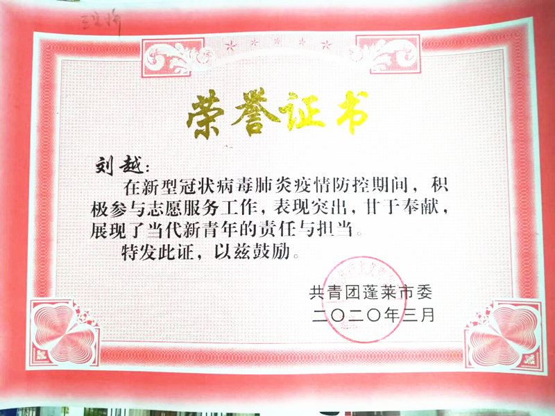 近日,学校五年制大专学院王智健、刘越两名学子因疫情期间的积极担当、勇于奉献分别受到潍坊市樱北经济专业合作社党总支和共青团蓬莱市委的来信感谢和荣誉表彰。