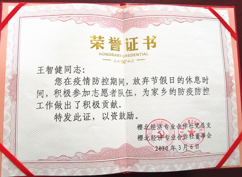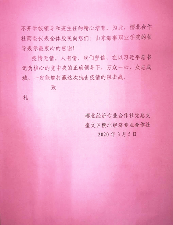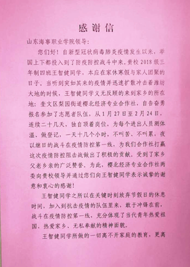 山东省潍坊市樱北经济专业合作社党总支和奎文区樱北经济专业合作社向我校发来感谢信,信中对学校五年制大专学院2018级三年制四班王智健同学在疫情期间做出的积极贡献表示诚挚的谢意和衷心的感谢;对学校在培养学生热爱祖国、热爱家乡、无私奉献等方面所做的教育工作表示感谢。此外,2016级五年一贯制二班刘越同学,在疫情期间积极参与当地志愿服务工作,受到共青团蓬莱市委表彰。