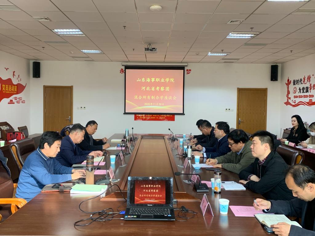 11月20日,由河北省委军民融合办、中科院雄安研究所、邢台学院、现代管理大学、天津大学、河北经贸大学、河北省山东商会等单位组成的考察团一行近20人至学校研讨交流混合所有制办学经验。学校副校长李振鹏、宋志刚,研究室主任郭素森等出席座谈交流。会上,座谈双方主要就混合所有制办学的实践经验、前沿政策研究以及学校办学成果等方面进行了深入交流,并就社会政策发展、混合制育人优势与人才培养体系建设、校企合作模式展开深入研讨。
