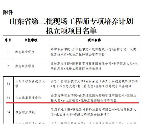 近日,山东省教育厅发布关于第二批现场工程师专项培养计划项目遴选评审结果,我校与山东通达国际船舶管理有限公司联合申报的《九五至尊VI +山东通达国际船舶管理有限公司+交通运输大类+水上运输类+现场工程师联合培养项目》成功获批立项。
