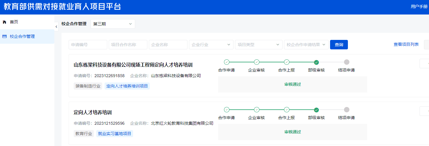近日,教育部供需对接就业育人项目平台公布第三批就业育人项目立项名单,我校马永青老师负责的《山东栋梁科技设备有限公司现场工程师定向人才培养培训》项目与李政老师负责的《北京红火轮教育科技集团有限公司就业实习基地》项目获批立项。