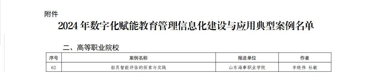 近日,山东省教育厅公布《2024年数字化赋能教育管理信息化建设与应用典型案例评选结果的通知》,我校航海学院李晓伟老师、杜敏老师提报的《船员智能评估的探索与实践》成功入选典型案例。本次活动经各单位推荐申报、专家评审等程序,在全省范围内共评选出本科高校(含成人高校)、高等职业院校、各级教育行政部门和中小学校(含中等职业学校)典型案例共300 项,其中高等职业院校共评出70 项。