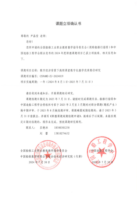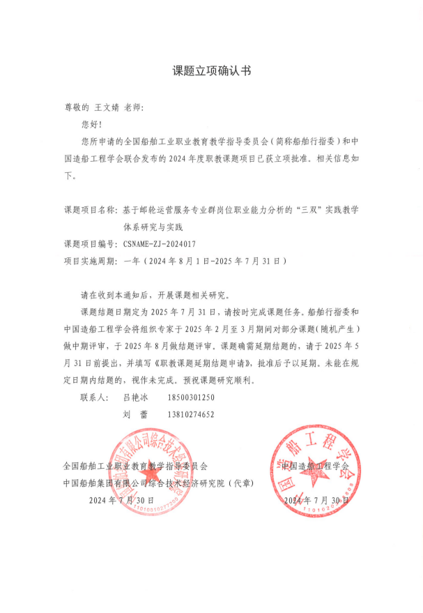 近日,国家船舶工业职业教育教学指导委员会与中国造船工程学会联合公布2024年度职教课题项目立项结果,我校朱妮妮老师主持的《产教融合背景下高职邮轮运营服务示性虚拟仿真实训基地建设的研究与实践》、王文婧老师主持的《基于邮轮运营服务专业群岗位职业能力分析的“三双”实践教学体系研究与实践》、尹晶莹老师主持的《数字经济背景下高职课堂数字化教学改革路径研究》以及徐萌老师主持的《基于岗位职业能力分析的邮轮运营专业实操课程“分区增值”评价指标体系构建与应用研究》4项课题获批立项。我校将以此为契机,进一步优化科研管理服务体系,为课题研究提供全方位的支持与保障,确保研究工作的顺利进行和高质量完成。