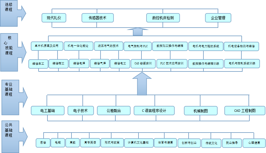 面向现代机电设备生产、应用及服务型企业。本专业培养适应生产、建设、服务和管理第一线需要,德、智、体、美全面发展的技术人才。掌握机电一体化技术专业的基本知识,具备较强的机电设备操作、机电产品组装、运行、调试、维护及机电产品售后服务的专业技能。从事机电设备及其他行业生产设备的安装维修、操作及管理,机电产品零部件设计、加工工艺编制、加工编程、测绘检验、机电产品营销及企业管理等实际工作的技术技能型人才。