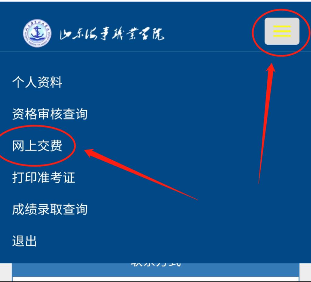 二、登陆系统,核实考生报名信息无误后,点击界面右上角导航键,点击“网上交费”选项。