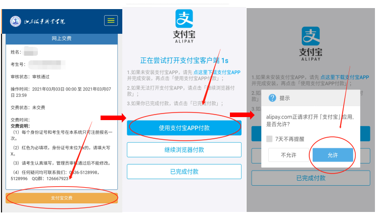 三、进入缴费界面,点击“支付宝交费”—“使用支付宝APP付款”—“允许打开支付宝应用”(如下图),然后付款,完成报名缴费。