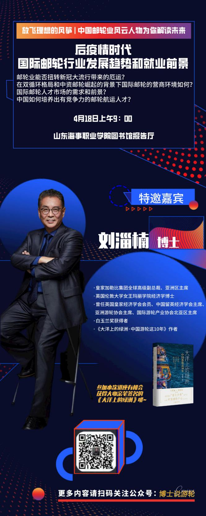 当此之时,我们有幸请来了皇家加勒比全球高级副总裁、亚洲区主席刘淄楠博士为我校师生带来题为“后疫情时代国际邮轮行业发展趋势和就业前景”专题讲座。欢迎全校师生4月18日上午9:00到图书馆报告厅倾听业界大咖良策益言,为邮轮行业必将到来的春天积蓄力量。