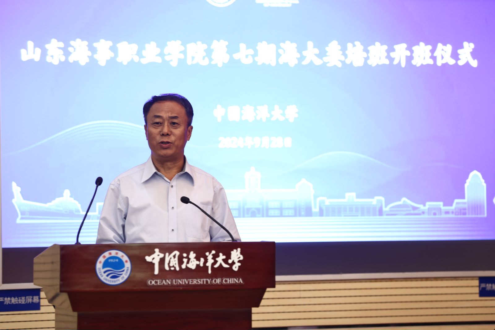 副校长宋志刚在仪式上作重要讲话,首先向中国海洋大学以及参与委培班管理和教学的领导、老师表示了最真挚的感谢,同时对第七期海大委培班的同学致以美好的祝愿。宋校长指出,两校自2015年起便开展合作办学项目,目前已联合培养学生1000余人是不断丰富和完善人才联合培养模式,进一步培植特色品牌专业的一项重要举措,同时也为海洋事业的发展培养了一批栋梁之材。宋校长表示,在中国海洋大学同学们有机会接触到最前沿的海洋科技知识,领略到最广阔的学术视野,感受到最浓厚的学术氛围。期望同学们珍惜在中国海洋大学的学习机会,在不断学习知识的同时积极参与各项实践活动,锻炼实践能力和创新精神,铭记山海院校训学风,脚踏实地、不懈努力,书写好不负青春,不负韶华的人生答卷。随后港口与航运管理专业新生周子涵代表新生发言。