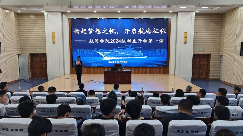 10月10日下午,航海学院 2024 级航海类专业新生开学第一课在图书馆报告厅举行,航海技术、轮机工程技术、船舶电子电气技术三个专业的全体师生参加本次活动。
