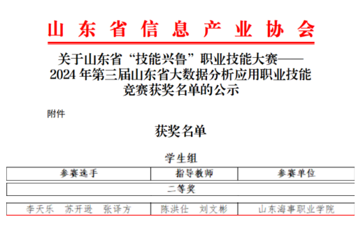 近日,2024年山东省“技能兴鲁”职业技能大赛——第三届山东省大数据分析应用职业技能竞赛在威海举行。我校智能与信息工程学院2023级大数据技术专业李天乐、苏开逊、张译方三位同学参加竞赛,(指导教师:陈洪仕、刘文彬)取得赛项二等奖。