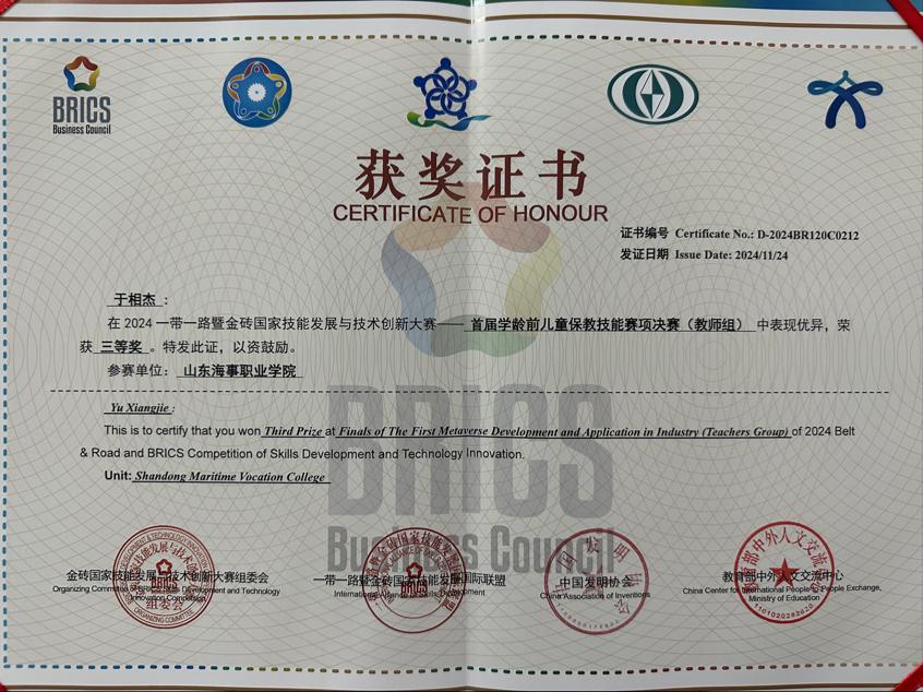 近日,“一带一路暨金砖国家技能发展与技术创新大赛——首届学龄前儿童保教技能赛项决赛”在潍坊高密举行,此次大赛聚焦学龄前儿童保教领域,旨在提升教师专业素养与实践能力,推动保育和教育结合的高质量发展,吸引了众多院校教师参与竞争,我校健康管理学院教师于相杰荣获教师组三等奖。