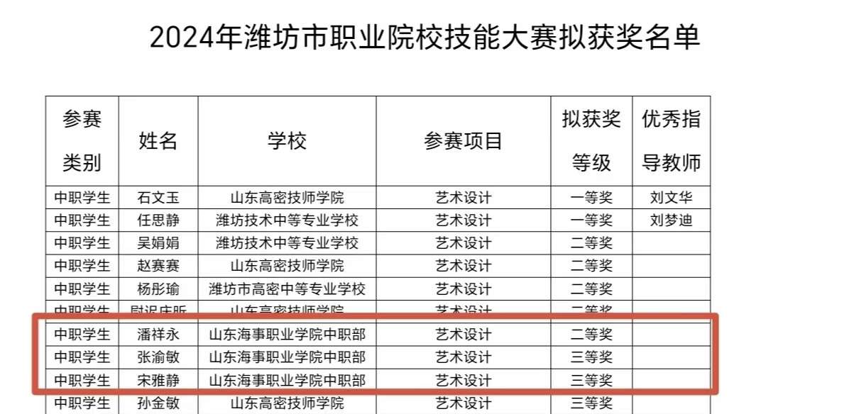 近日,在潍坊市职业院校技能大赛中职学生赛道中,我校五年制大专学院喜获佳绩。潘祥永同学获“艺术设计”赛项二等奖,宋雅静、张渝敏同学喜获“艺术设计”赛项三等奖;祝怡婷、逄志飞、步雅轩同学喜获“学前教育”赛项三等奖。