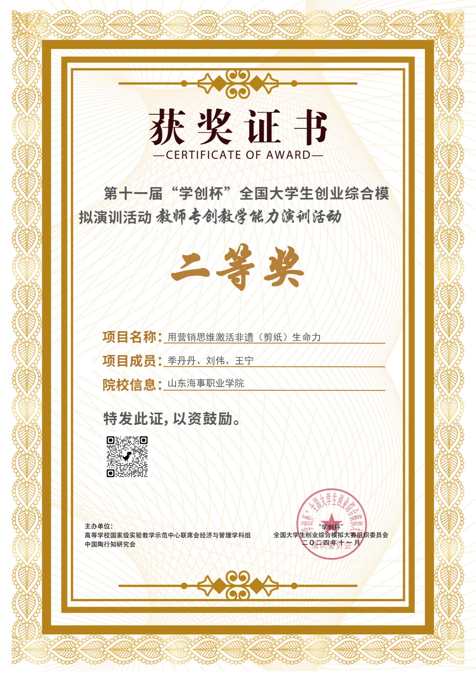 本次比赛旨在深化国内职业院校创新创业教育改革,促进创新创业教育与专业教育深度融合,以提高教师“专创融合”教学能力为核心,重点考察教学团队专创融合课程内涵建设,推动专创深度融合,是全国职业学院教师专创教学能力的大比拼。港航管理学院季丹丹、刘伟、王宁三位老师组成的参赛团队,认真备赛反复打磨专创融合教学方案,不断调整课堂应用环节和教学效果的评估,最终凭借《用营销思维激活非遗(剪纸)生命力》教学案例荣获全国二等奖。