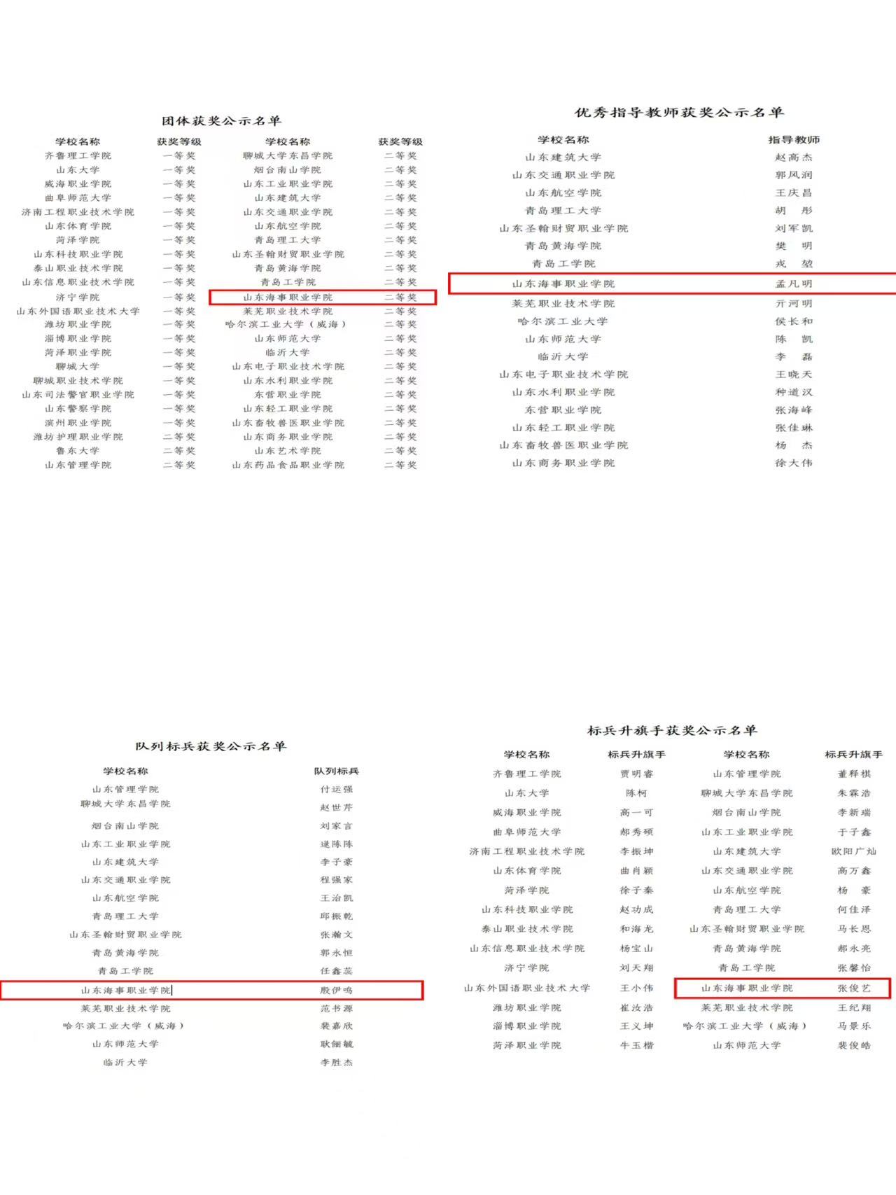 近日,由省教育厅、省委宣传部、省国防动员办公室、省军区政治工作局主办的山东省大学生国旗护卫队现场展示活动成功举办。我校荣获团体二等奖;孟凡明老师荣获“优秀指导教师”,张俊艺同学荣获“标兵升旗手”,殷伊鸣同学荣获“队列标兵”。