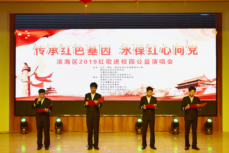 本次活动由山东(潍坊)海洋科技大学园、潍坊市红色文化研究会、共青团滨海区委、滨海区中央城区开发服务中心主办,旨在庆祝新中国成立70周年,弘扬红色文化,传承红色基因,培育学生爱国主义情怀,以红色教育强化了学生爱国爱党意识。演唱会走进学院,让师生们在欣赏歌曲的轻松愉快氛围中,近距离体会红色文化,接受红色精神的洗礼,进一步激发了同学们的爱国热情,激励了同学们奋发有为的报国之志。