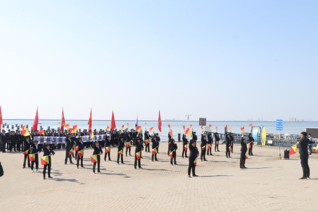 在庄严嘹亮国歌中,海上祭奠仪式正式开始。参加海祭英烈活动的师生们集体致追悼词,向革命英烈致以哀思缅怀以及崇敬之情。随后,航海学院旗语队在北海之畔进行了一场气势磅礴的旗语表演。晴空之下,学院学子用庄重的旗语,演绎了一场恢弘振奋的海员之歌,用特殊方式表达着对先辈赤胆忠魂的敬仰和追忆。最后,参加活动的师生们集体向抗击外寇为国捐躯的海疆战士默哀,将寄托师生无限追思之情的洁白的菊花缓缓洒入大海,以告慰海上英灵,寄托哀思。海祭仪式在学院师生对英烈们的庄重缅怀默哀中结束。