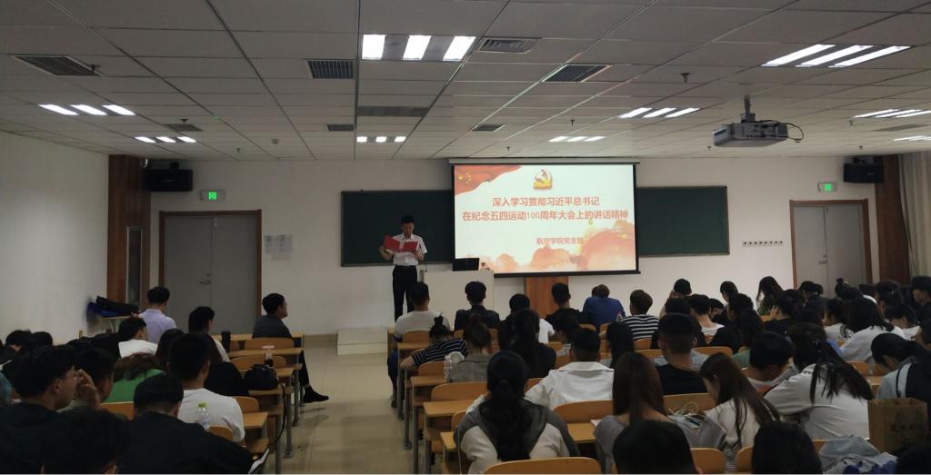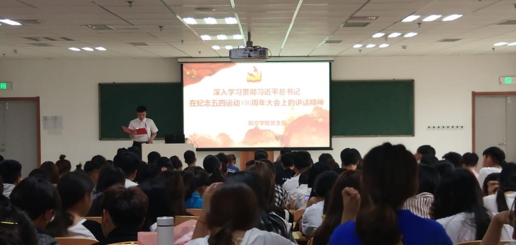航空学院党支部组织全体师生在图书馆113教室进行了集中学习,观看了习近平总书记在纪念五四运动100周年纪念大会上的讲话视频,领学了新华评论员文章:《让五四精神在新时代绽放光芒》《让爱国主义的伟大旗帜在心中高高飘扬》《让奋斗成为青春最亮丽的底色》《练就过硬本领,锤炼品德修为》等,加深了对习近平总书记讲话精神的理解,并进一步领会牢记了习近平总书记在会上给新时代中国青年提出的六点要求:“树立远大理想、热爱伟大祖国、担当时代责任、用语砥砺奋斗、练就过硬本领、锤炼品德修为”,努力成为德智体美劳全面发展的社会主义建设者和接班人,习总书记的要求为学院进一步做好新时代学生管理工作指明了方向。