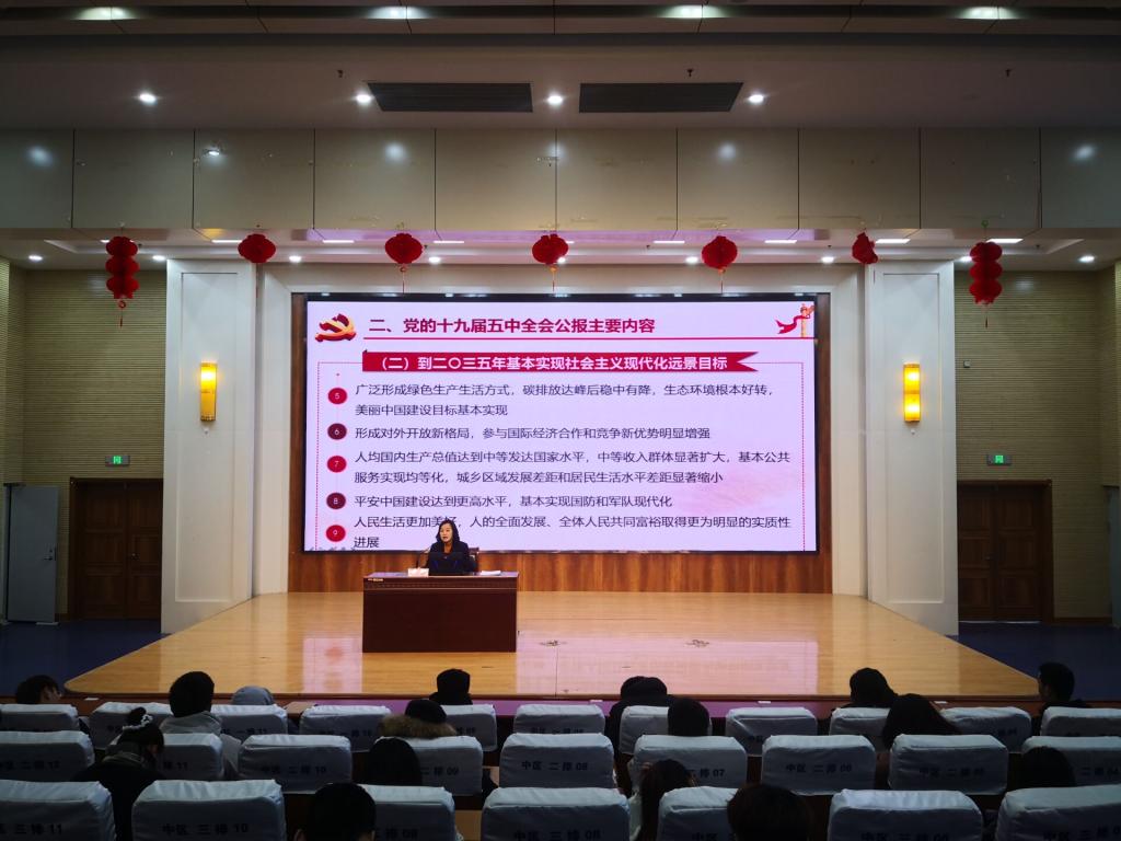 为深入学习宣传党的十九届五中全会精神,切实引领广大团员和党员学生坚定共产主义理想信念,市教育系统宣讲团成员、教学党支部书记、马克思主义学院院长冯小红同志于12月3日在图书馆报告厅为各二级学院学生代表做了十九届五中全会精神传达报告会。