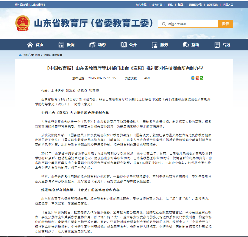 【中国教育报】山东省教育厅等14部门出台《意见》推进职业院校混合所有制办学