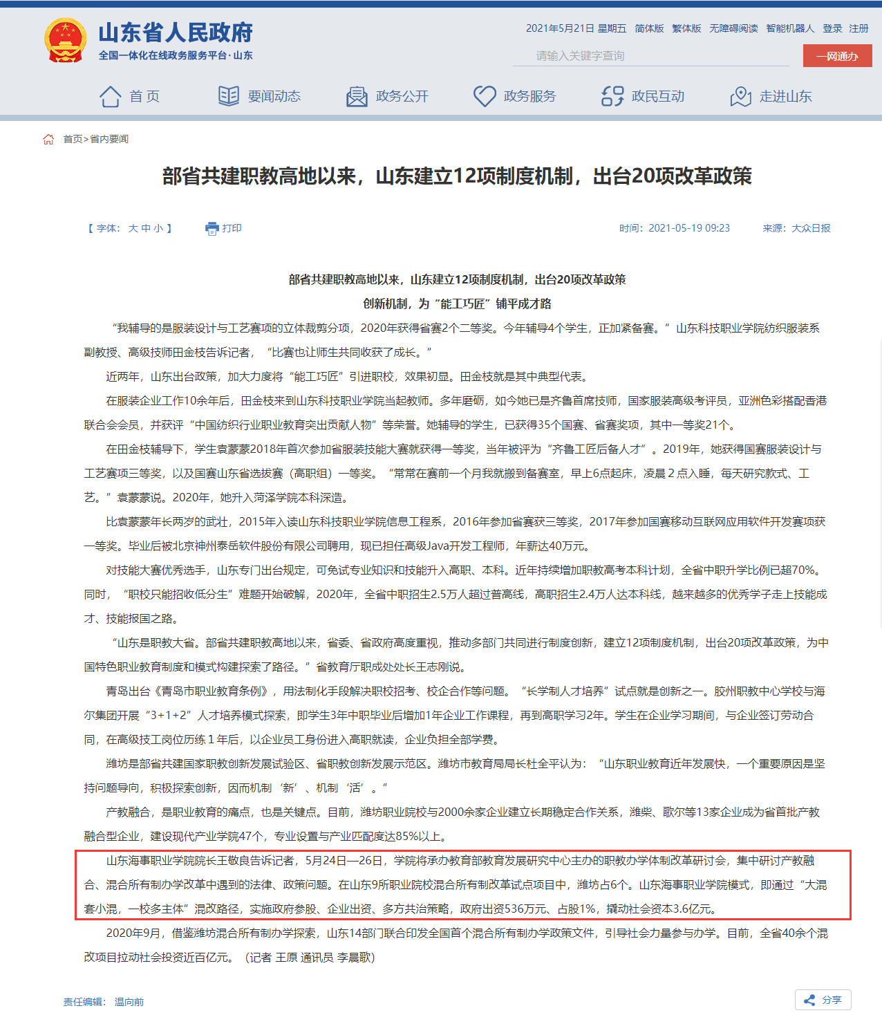 【山东省人民政府】部省共建职教高地以来,山东建立12项制度机制,出台20项改革政策