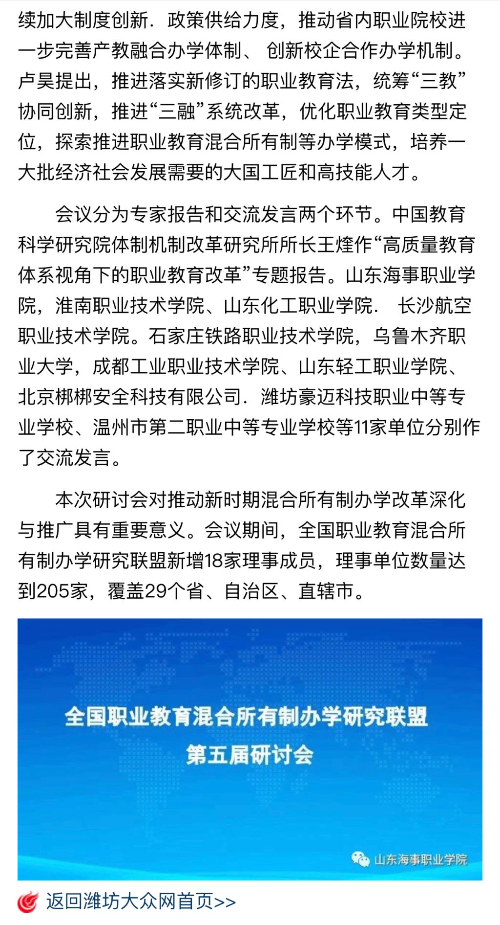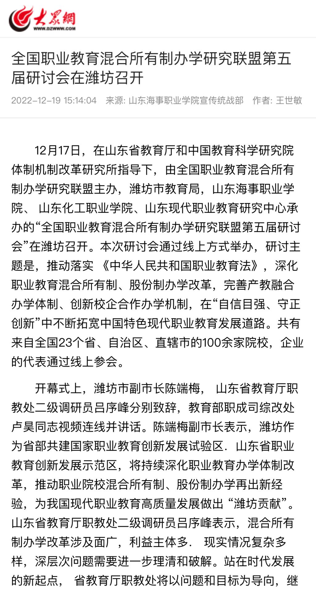 【大众网】全国职业教育混合所有制办学研究联盟第五届研讨会在潍坊召开