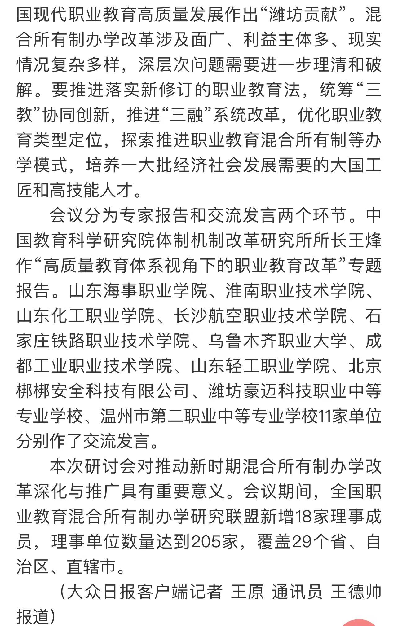 【齐鲁晚报】全国职业教育混合所有制办学研究联盟第五届研讨会在潍坊召开