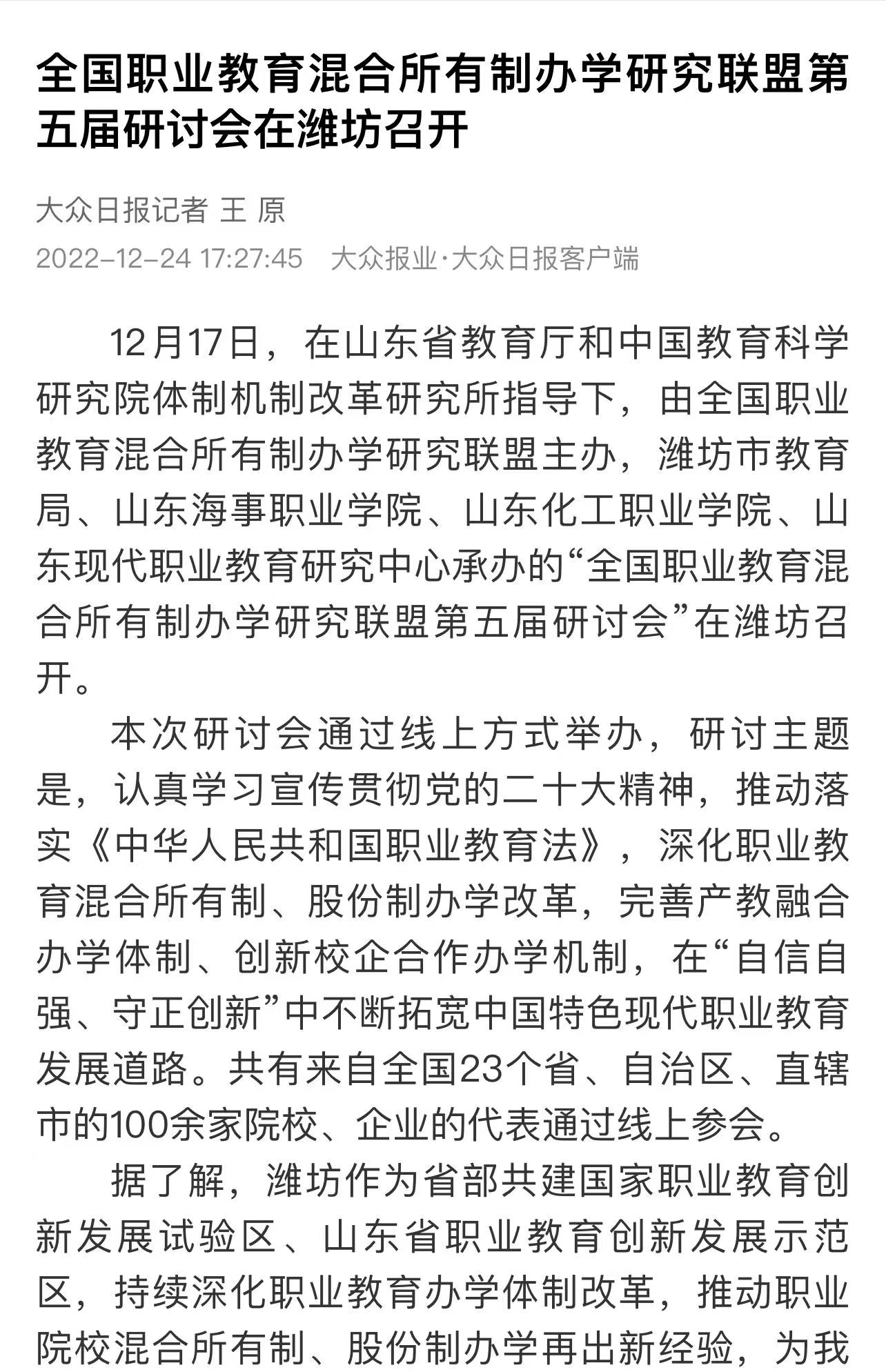 【大众日报】全国职业教育混合所有制办学研究联盟第五届研讨会在潍坊召开