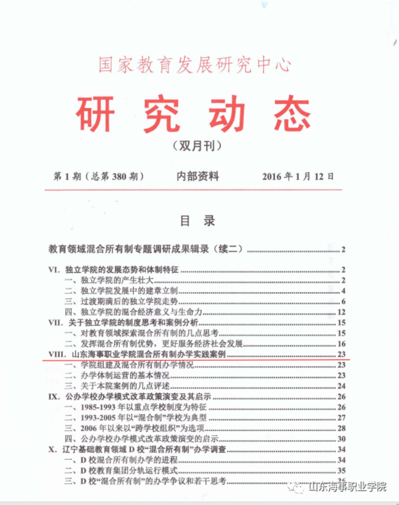 2016年--1月,国家教育发展研究中心《研究动态》刊发学校混合所有制办学实践案例。