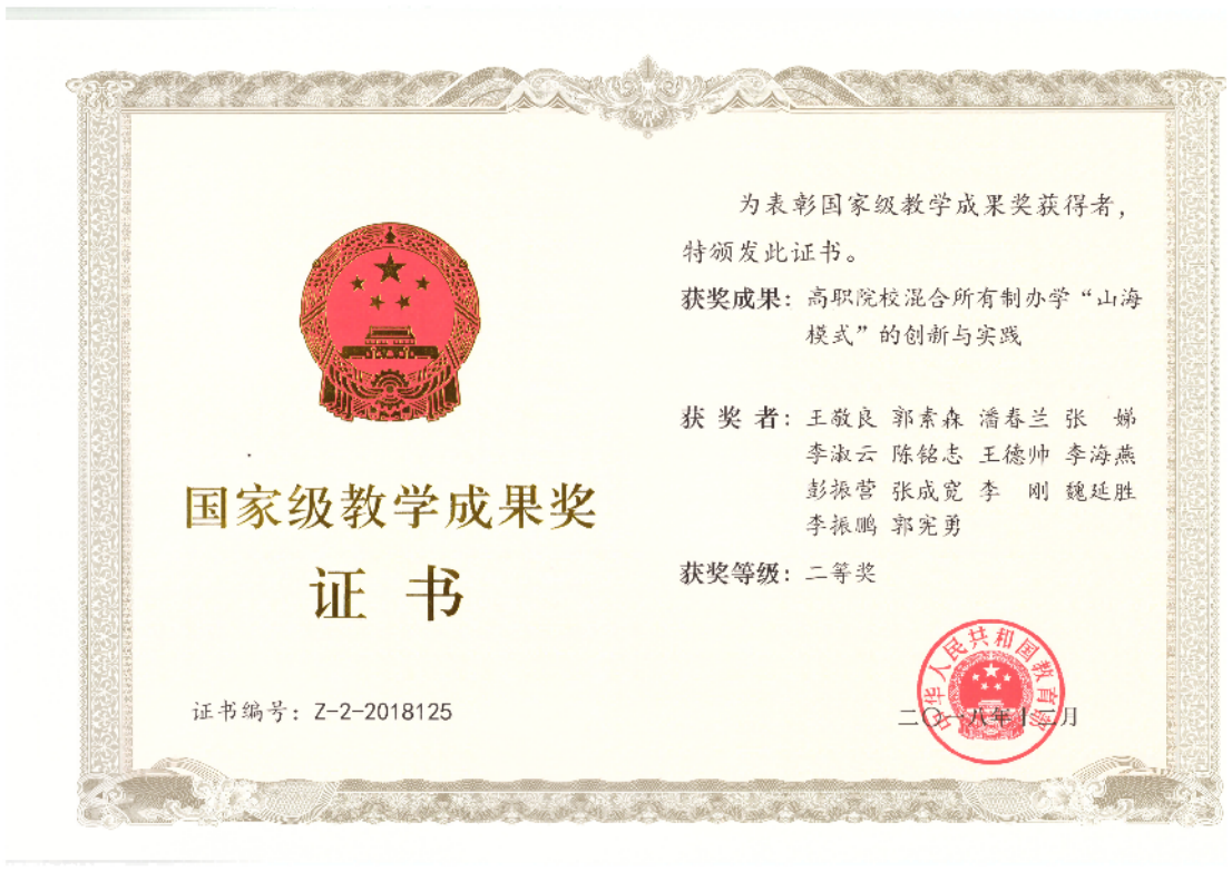 2018年--学校“高职院校混合所有制办学‘山海模式’的创新与实践”荣获国家职业教育教学成果奖二等奖、山东省职业教育教学成果奖特等奖。