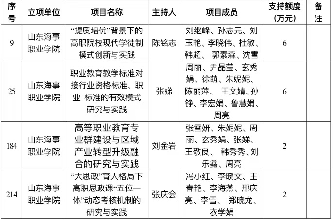 根据《教育部 山东省人民政府关于整省推进提质培优建设职业教育创新发展高地的意见》(鲁政发〔2020〕3号)、《山东省教育厅 山东省财政厅关于开展山东省职业教育教学改革研究项目立项工作的通知》(鲁教职字〔2015〕11 号)和《山东省教育厅关于做好2021年度山东省职业教育教学改革研究项目申报工作的通知》(鲁教职函〔2021〕1号)精神,经学校申报、专家评审,全省高职、中职、相关高校和研究所共有519项省级教学改革研究项目入围立项名单,其中我校申报的项目中有4项成功获批立项,并均获经费支持,有两个项目分获6万元支持,两个项目分获2万元支持。立项项目目前已在省教育厅网站公示。立项名单如下: