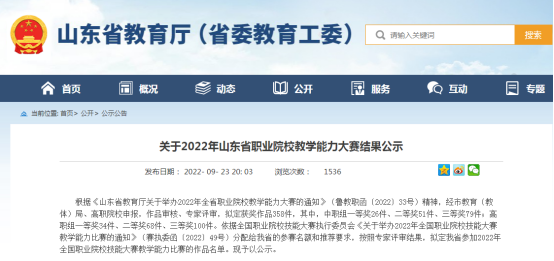 9月23日,山东省教育厅对2022年山东省职业院校教学能力大赛结果进行公示,我校尹晶莹老师团队、李怡伟老师团队分别荣获大赛一等奖和三等奖,是我校深化教育教学改革,促进教师专业发展的又一硕果。